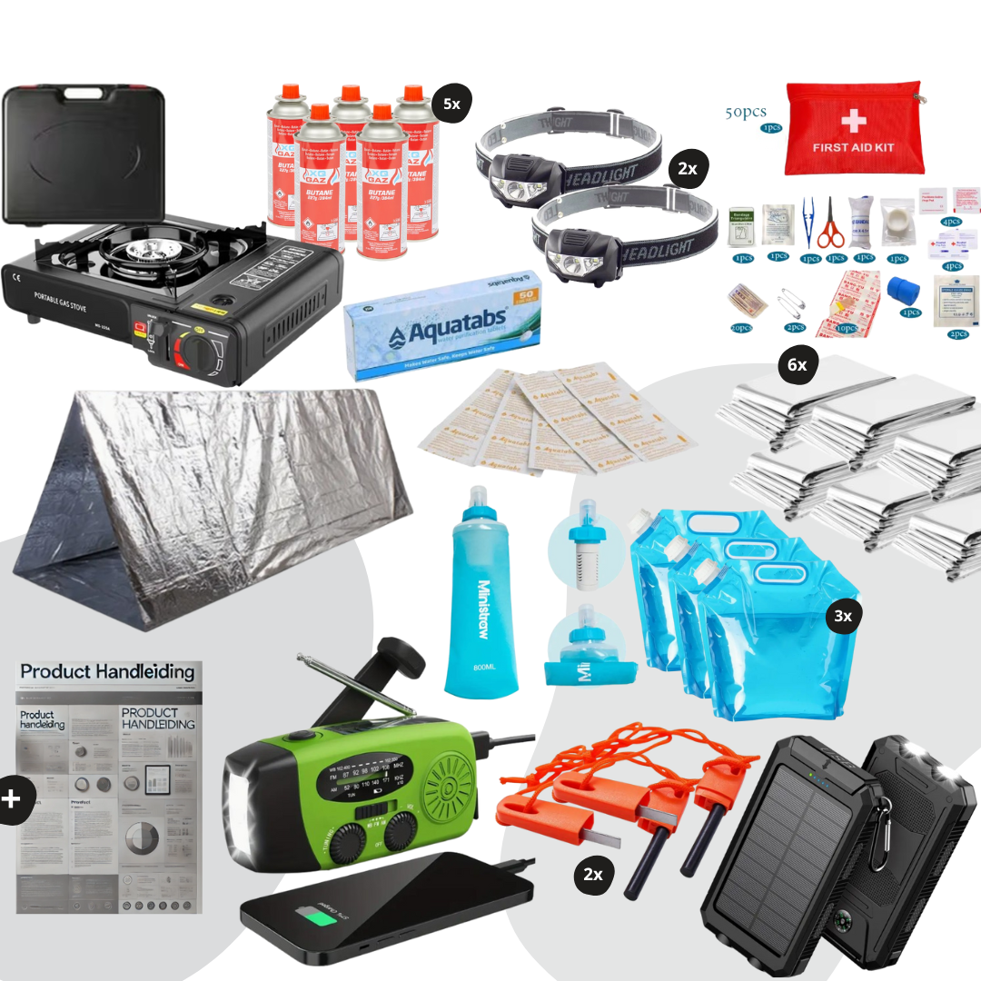 Comfort Pakket: Naast de inhoud van het Plus Pakket bevat dit pakket een overlevingstent en opvouwbare watercontainers, zodat je beter bent voorbereid op langere noodsituaties.